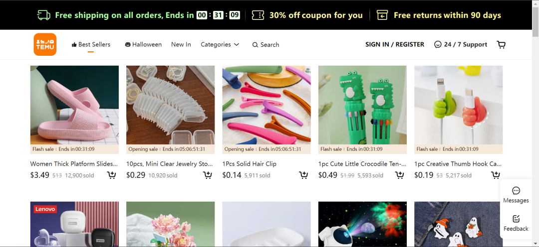 據(jù)了解,在Temu平臺(tái)首頁(yè)上,女士厚底拖鞋及透明首飾盒(10個(gè)裝)銷量最好,分別為12900單、10920單,價(jià)格分別為3.49美元、0.29美元。除此之外,消費(fèi)者還可享受免郵費(fèi)、7折優(yōu)惠、90天內(nèi)免費(fèi)退貨等福利。