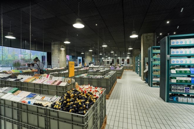 HARMAY 話梅成都悠方店,延續(xù)一如既往的倉儲文化以及“一店一設”設計理念,將倉儲空間細節(jié)結合店鋪格局陳列,打造便利場景化的購物空間。店鋪入口從倉庫折疊門演變重設,鏈接模塊化的門板構建可變形的商業(yè)入口邊界。店內陳列貨架則受到大宗貨物轉運時所需工具啟發(fā),用區(qū)域堆疊貨框的形式把產品以話梅獨有的貨物排列邏輯,呈現出豐富清晰的視覺觀感。