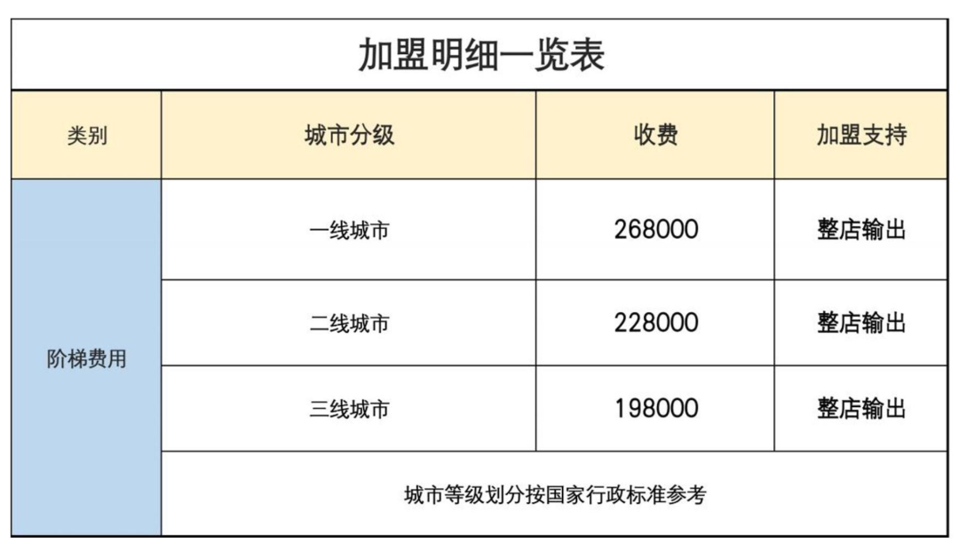 「深響」以加盟商的名義咨詢價(jià)格,對(duì)方發(fā)來(lái)了一個(gè)表格,一線城市加盟費(fèi)在26.8萬(wàn)元,二線城市22.8萬(wàn)元,三線城市19.8萬(wàn)元,提供的加盟支持為整店輸出,即從選址到開(kāi)業(yè)的籌備過(guò)程。在表格的下一頁(yè),還寫(xiě)出了利潤(rùn)公式:5教室*5次課*10-15人*2天(周末)*50周*200(單價(jià))=2500000(年度毛利)。