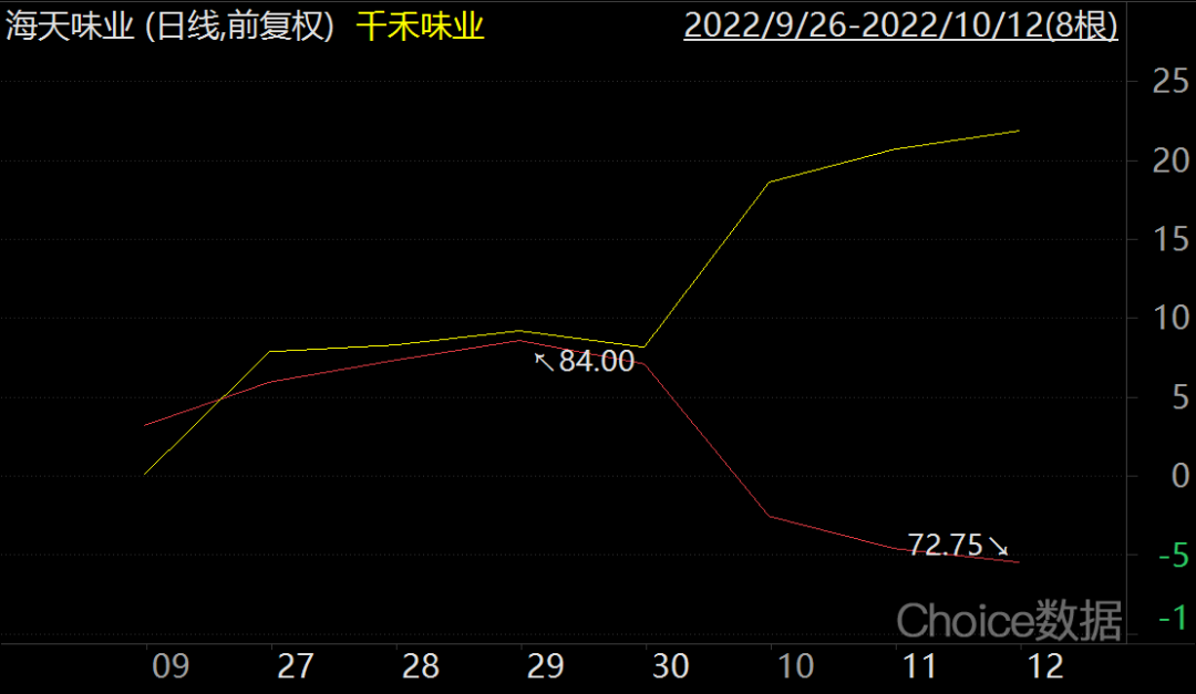 圖:海天千禾近期走勢,紅:海天 黃:千禾,來源:Choice金融客戶端