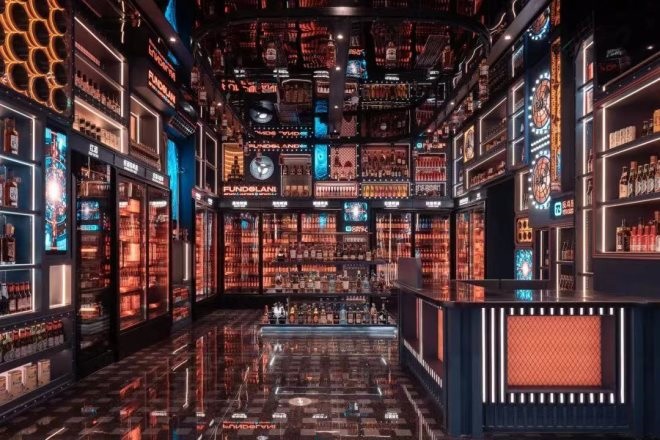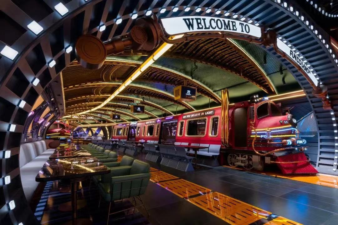 首店門口處整齊排列著酒柜和潮玩柜,入口處直走就是隧道餐吧,餐吧一側擺放著「盜夢列車」,保齡場館則被設計成復古站臺,旁邊一側?恐鴱凸帕熊嚕琇iveHouse酒吧則由好聲音歌手和300+款酒組成,電玩區(qū)包含各種電玩設備,閃爍的紅綠霓虹燈光,讓游客仿佛置身于游戲中的虛擬世界。