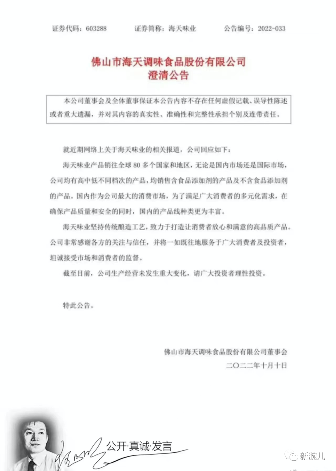 再看海天最近10月10日發(fā)布的“澄清公告”,他們在這份公告中提到了海天的海外業(yè)務(wù)和國內(nèi)業(yè)務(wù)產(chǎn)品中都有高中低不同檔次,均銷售食品添加劑和不含添加劑的產(chǎn)品……