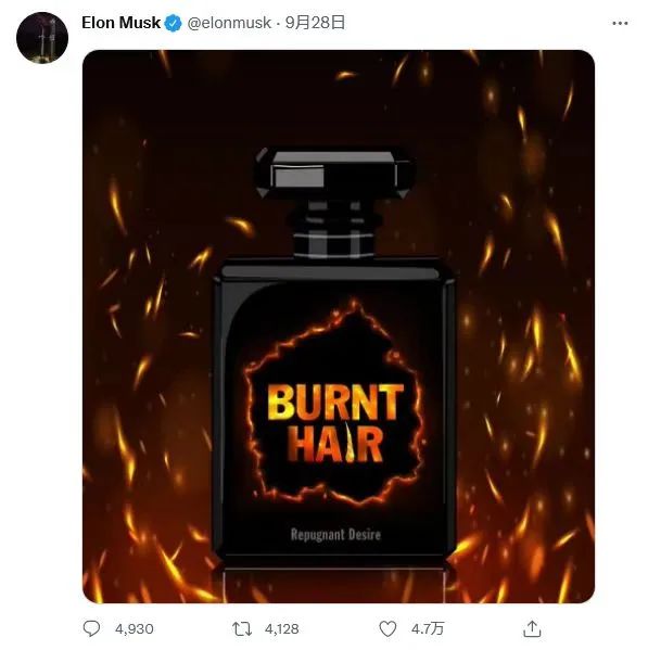 據(jù)了解,馬斯克曾在9月發(fā)布一張帶有“BURNT HAIR”字樣的概念圖,為此款香水發(fā)布預(yù)熱。10月9日,馬斯克發(fā)布產(chǎn)品圖,再次預(yù)告“(香水)即將到來”。