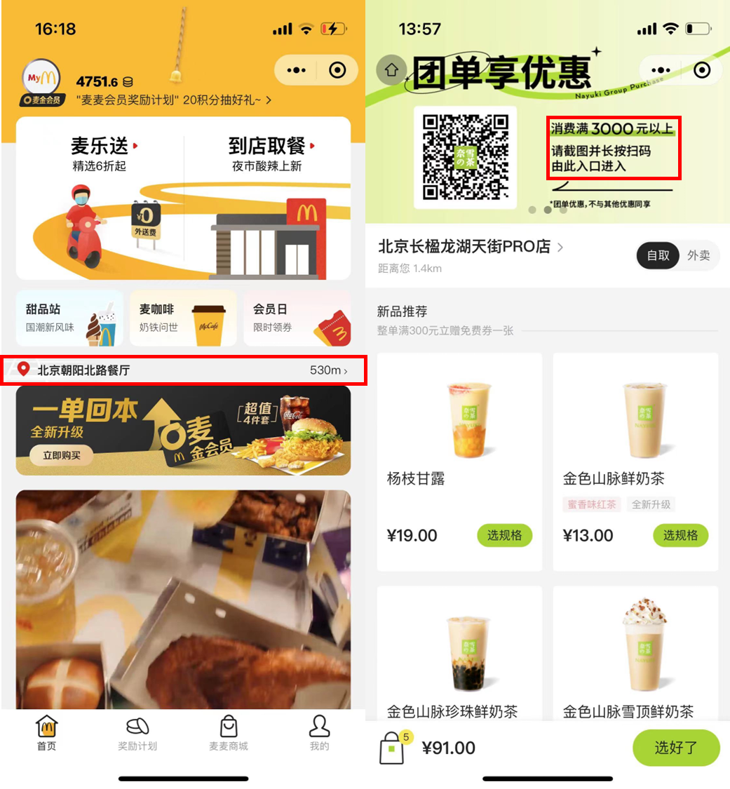 比如麥當(dāng)勞的團(tuán)餐預(yù)定入口極深,需要點(diǎn)擊門店的小細(xì)條,才能看到團(tuán)餐預(yù)定,再次點(diǎn)擊后,點(diǎn)餐界面才有團(tuán)購(gòu)專享的菜單,或者是人工通過(guò)客服或是經(jīng)理的企業(yè)微信聯(lián)系。