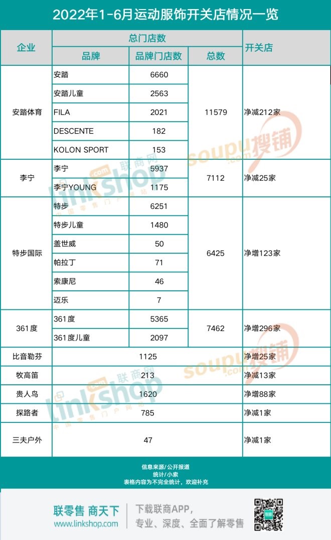 擴張最快的企業(yè)為特步國際,凈增296家,門店總數達6425間;門店總數破萬的領頭羊安踏體育在2022年上半年則暫緩了對外擴張的腳步,門店數量凈減21家。