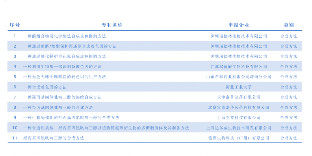 截至2022年9月,已經(jīng)有9家公司/單位提交了和合成玻色因的方法相關(guān)的專利申請。