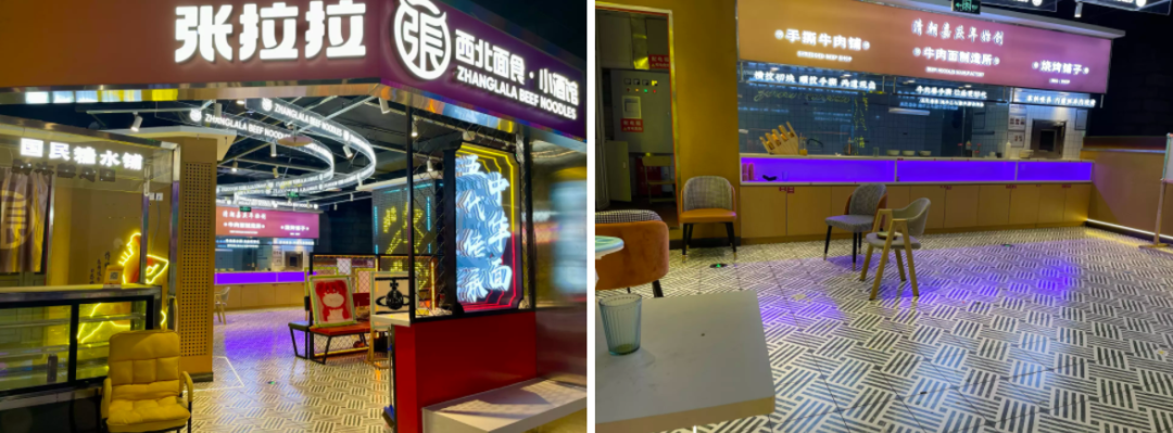 這兩家面館均位于大型購物中心的“美食城”里。探店時正值工作日中午12時左右,開菠蘿財經(jīng)注意到,同一商城、同一樓層的其它快餐店吸引了眾多顧客。