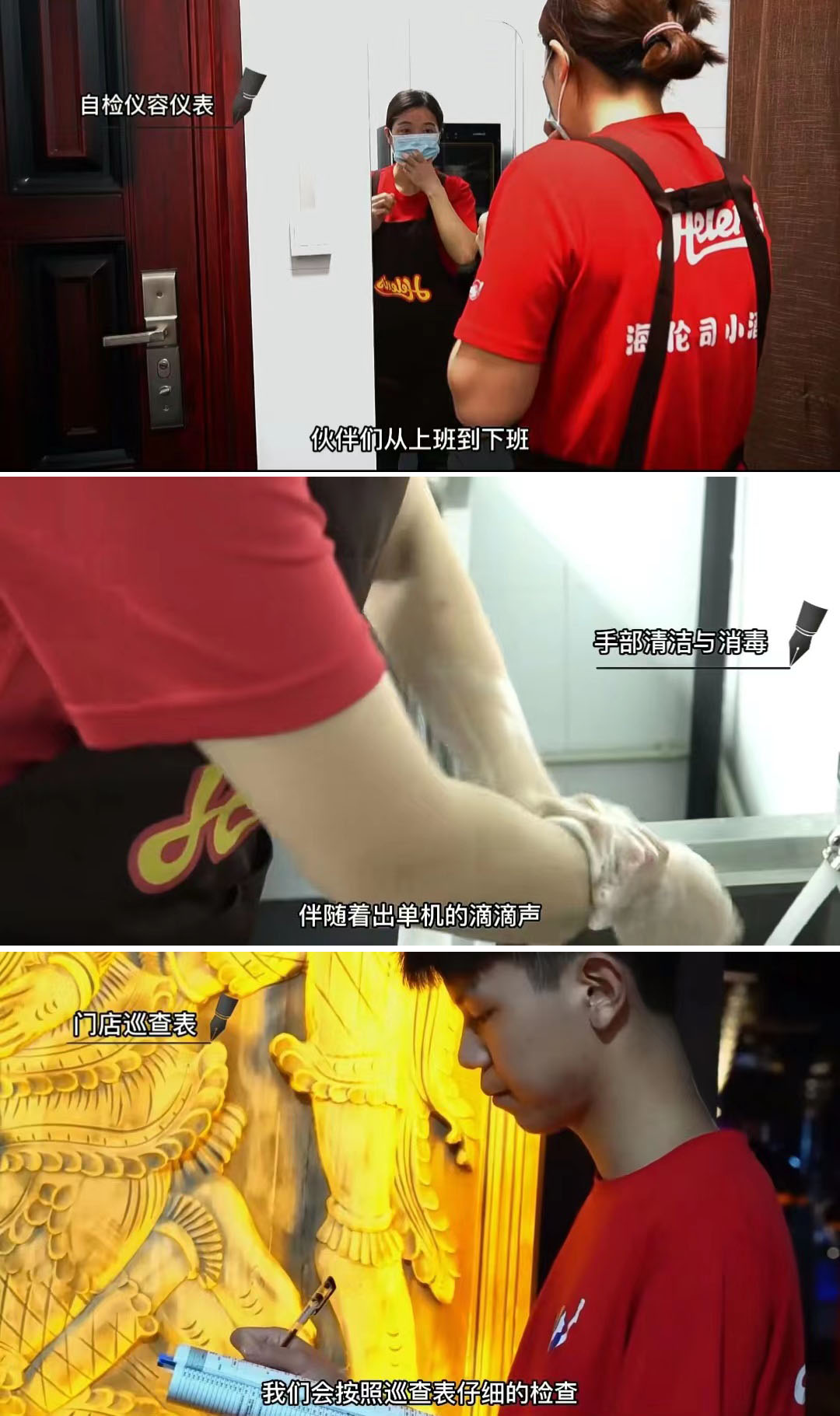 海倫司去年底也加入了“自檢”行列,自檢員化身紅衣小哥,從儀容儀表、門店各角落巡查、驗收貨物、操作間清潔等不同維度的細(xì)節(jié)逐一自檢,并通過視頻+圖文的形式對外展示。