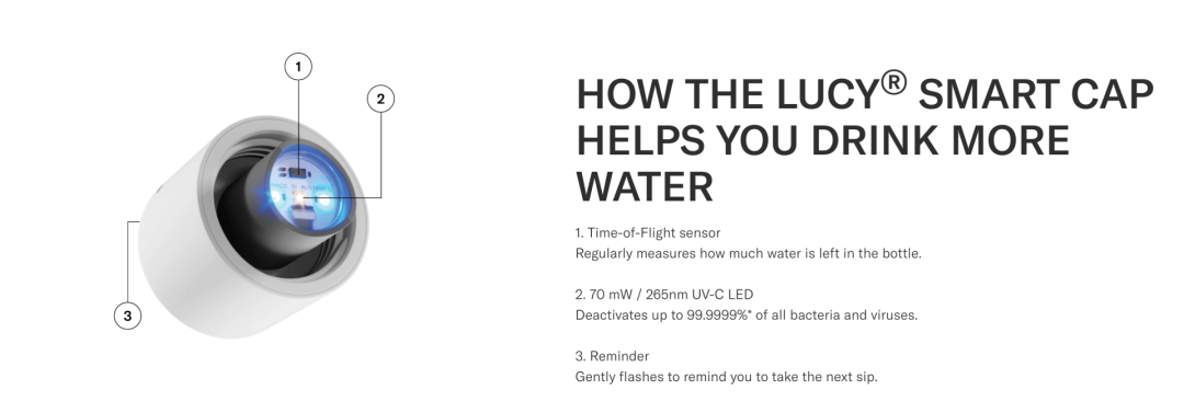 非常值得一提的便是Lucy智能瓶蓋,它主要通過紫外線輻射系統(tǒng)對水進(jìn)行殺菌和過濾,可以以接近100%的滅活效率殺死水中潛在的病毒和致病細(xì)菌。同時,Lucy智能瓶蓋還與Waterdrop自主研發(fā)的Hydration App聯(lián)動,長期跟蹤和記錄消費(fèi)者的飲水行為,并按時提醒消費(fèi)者正確的飲水時間,幫助消費(fèi)者養(yǎng)成良好的飲水習(xí)慣。