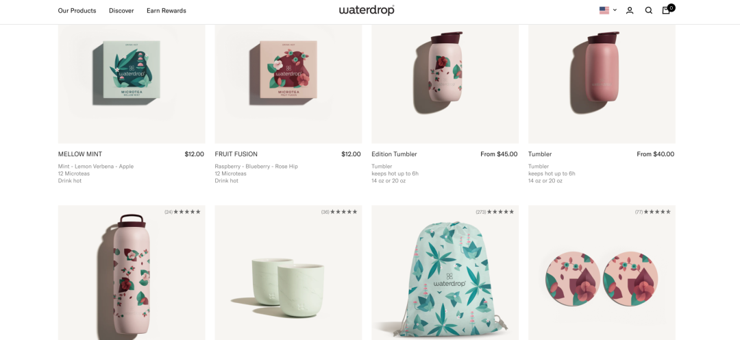 Waterdrop的產(chǎn)品線主要包括兩類產(chǎn)品:無糖小方塊(Microdrink)和飲水器具(Drinkware)。無糖小方塊主要以盒裝形式出售,一盒包括12顆方塊。Waterdrop還專門為無糖方塊產(chǎn)品線設(shè)置了兩款細(xì)分產(chǎn)品——無糖方塊飲和無糖方塊茶。其中,無糖方塊飲包含14種口味,成分主要包括14種不同的植物,并且不同的植物成分對應(yīng)不同營養(yǎng)功效的方塊。比如YOUTH系列方塊則主要由青春抗老的維生素(維生素C、B2、B3)和養(yǎng)生植物(人參、蘆薈、桃、生姜)組成。