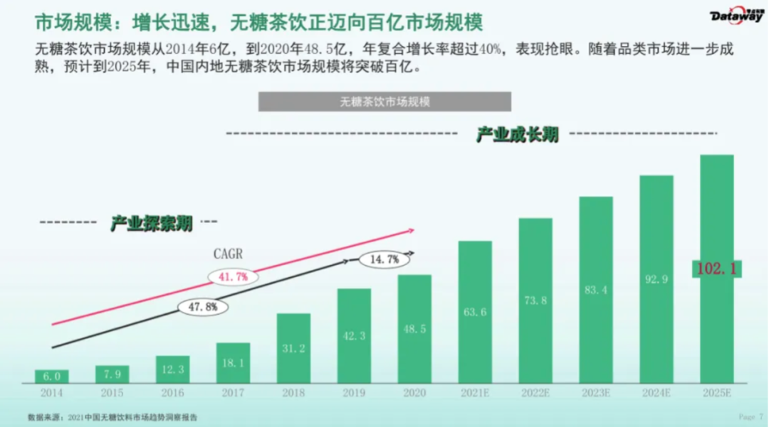 投射在飲料市場,即為近兩年時興的“0糖0脂0卡”,這一種消費心理變化在2020年開始捧火了無糖茶飲。零點有數(shù)《2022年中國無糖茶飲行業(yè)洞察報告》顯示,無糖茶飲產(chǎn)業(yè)已進入快速穩(wěn)定發(fā)展的新階段,預計到2025年,中國內(nèi)地無糖茶飲市場規(guī)模將突破百億。