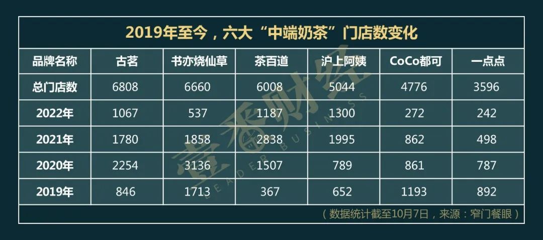 截至2022年10月7日,中端奶茶市場的六大品牌古茗、書亦燒仙草、茶百道、滬上阿姨、CoCo都可、1點點的門店數(shù)及近些年變化情況如下: