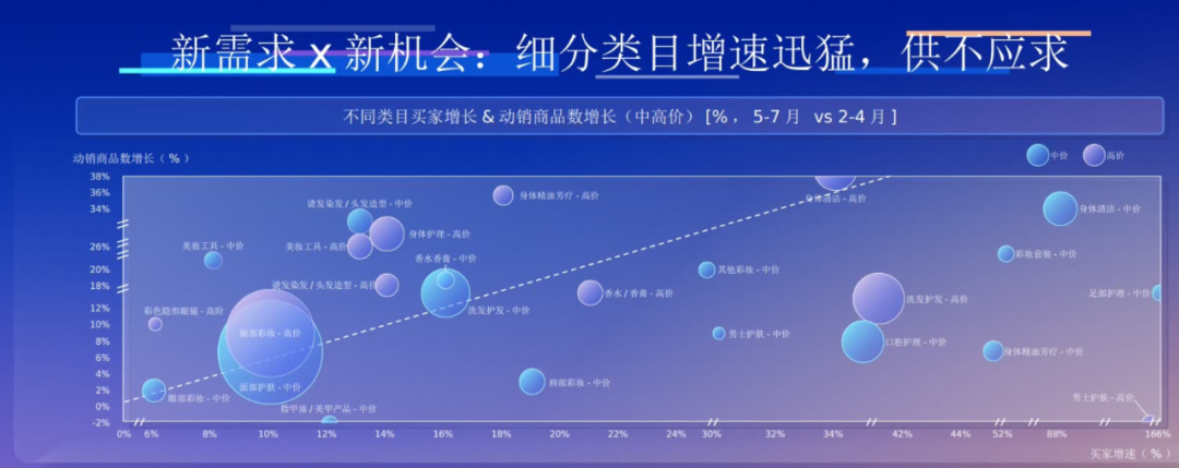 橫坐標(biāo)是買家增速,縱坐標(biāo)是動(dòng)消商品增長(zhǎng),縱坐標(biāo)數(shù)值越高說(shuō)明供給越充足。四象限圖中間有一條斜虛線,在虛線的上方代表著用戶的需求多,同時(shí)供給也更充足的品類,比如面部彩妝、面部護(hù)理等等,這些被稱之為熱門賽道。