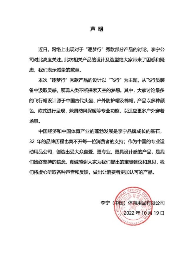 針對(duì)爭(zhēng)議性商品,10月19日上午,李寧官方微博發(fā)布聲明稱:近日,網(wǎng)絡(luò)上出現(xiàn)對(duì)于“逐夢(mèng)行”秀款部分產(chǎn)品的討論,李寧公司對(duì)此高度關(guān)注。此次相關(guān)產(chǎn)品的設(shè)計(jì)及造型給大家?guī)砹死Щ蠛鸵蓱],我們表示誠摯的歉意。