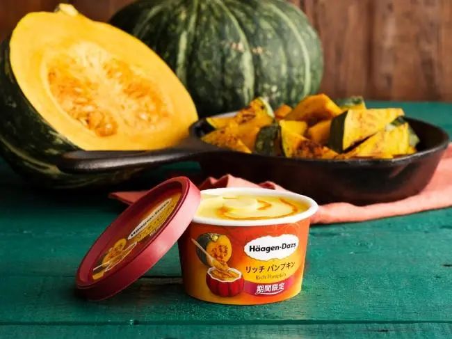 哈根達斯同樣也是選用了北海道的惠比壽南瓜,推出了季節(jié)限定的南瓜迷你杯。在奶香濃郁的冰淇淋中加入了烤制的南瓜泥,增添了南瓜溫和濃郁的風(fēng)味。這在不少消費者的評價中成了南瓜杯最亮眼的神來之筆,正是烤南瓜醬才沒有被濃郁的奶味過分掩蓋,反而凸顯了南瓜溫柔的甜味。