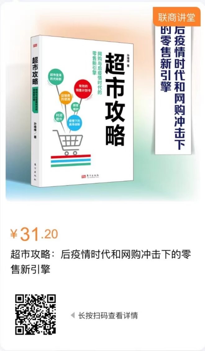 最后,為更好的回饋讀者,聯(lián)商書城新書首發(fā),正版好書特價回饋,原價48元的《超市攻略:后疫情時代和網(wǎng)購沖擊下的零售新引擎》現(xiàn)65折以31.20元出售,零售之路一起進(jìn)階,識別圖中二維碼即可立即購買。