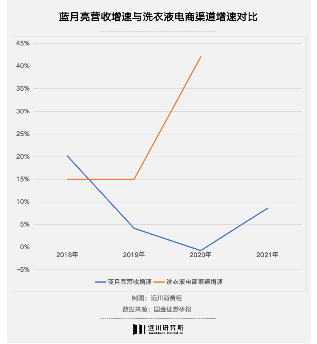從結(jié)果來看,藍(lán)月亮的營收增速和洗衣液電商渠道增速是脫節(jié)的。2019年后,洗衣液在電商的銷售直線上升,藍(lán)月亮的營收卻不增反降——在電商這個(gè)天然透明的比價(jià)環(huán)境里,藍(lán)月亮的品牌溢價(jià)無從談起。