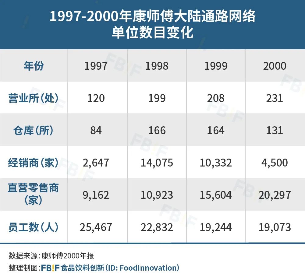 到2000年末,康師傅經(jīng)銷商數(shù)調(diào)整為4500家,直營零售商則從10923家增長至20297家,數(shù)目將近翻了一倍。