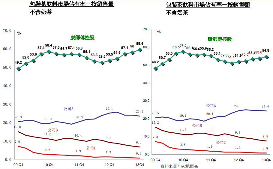 甚至在2013年的第4季度,剔除奶茶的情況下,康師傅茶飲料銷售額和銷量的市占率更是分別高達54.8%和59.4%。