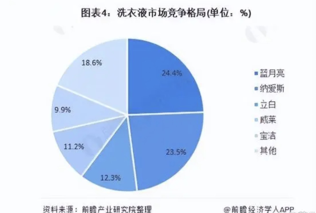 據前瞻研究院2020年統(tǒng)計數據顯示,藍月亮市場占有率為24.4%,市場占有率最高;納愛斯緊隨其后,市場占有率為23.5%。