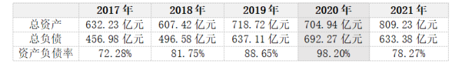 2016年,國(guó)美的期末總資產(chǎn)為618.02億元,總負(fù)債為408.27億元,資產(chǎn)負(fù)債率在66.06%,在70%的警戒線以下。之后卻一路飆升,2020年達(dá)到了98.2%的最高位。