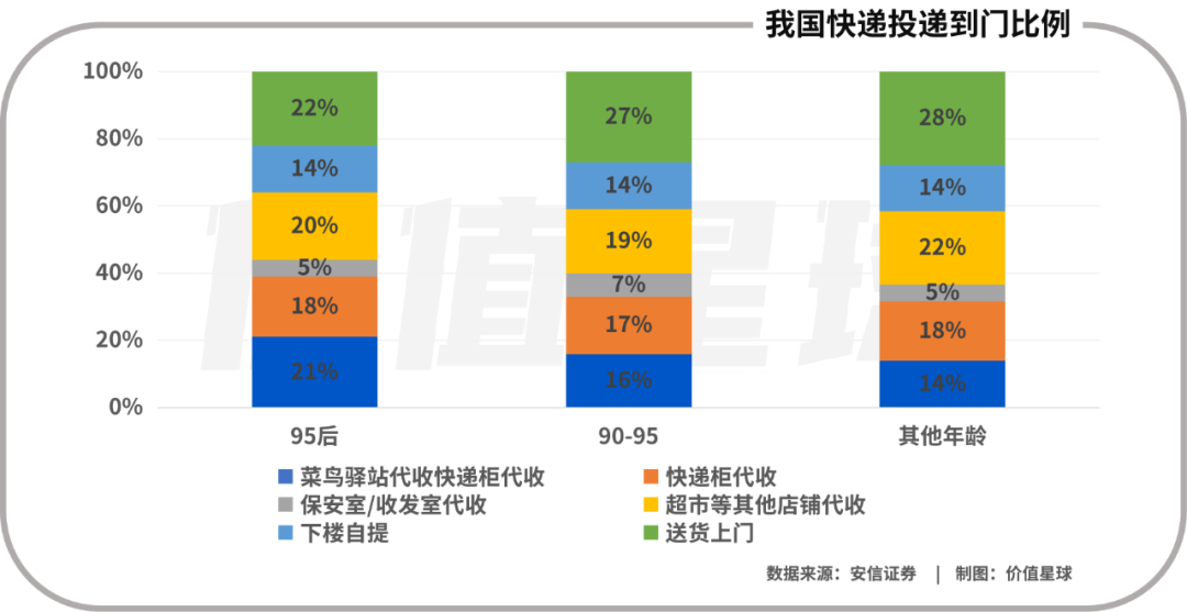 根據(jù)2020年BCG《90后快遞生活報告》,我國95后消費者使用代收服務(wù)(菜鳥驛站代收、快遞柜代收、保安室/收發(fā)室代收、超市等其他店鋪代收)比例高達64%,上門投遞比例約36%;其他年齡消費者代收比例均為59%,上門投遞比例約41%。綜合來看,我國快遞上門投遞比例只有40%左右。