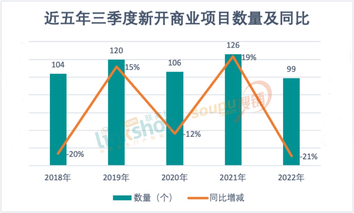 從聯(lián)商網(wǎng)零售研究中心統(tǒng)計(jì)的近五年(2018年至2022年)三季度開業(yè)的商業(yè)項(xiàng)目情況上看,今年第三季度新開99個(gè)商業(yè)項(xiàng)目,同比下跌21%,是近五年三季度開業(yè)數(shù)量最低的。