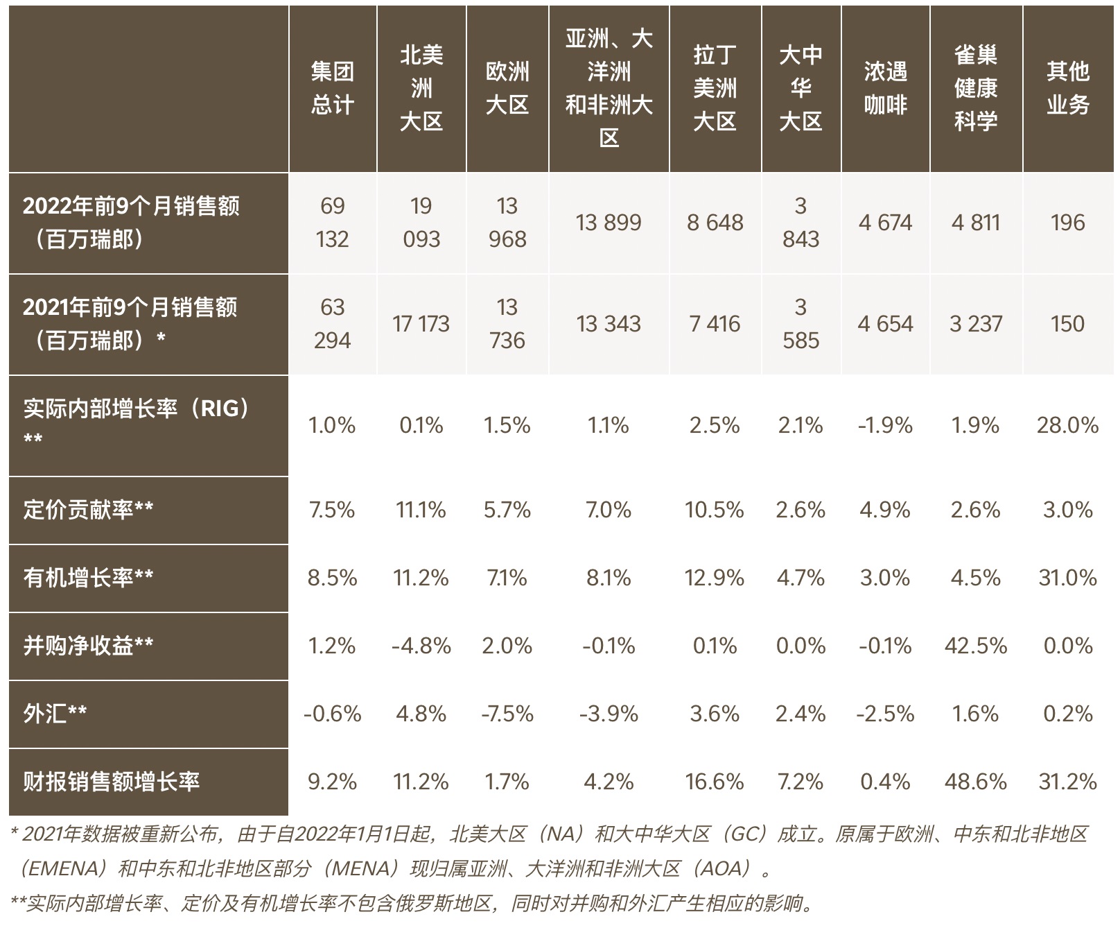 雀巢前9個月總銷售額同比增長9.2%