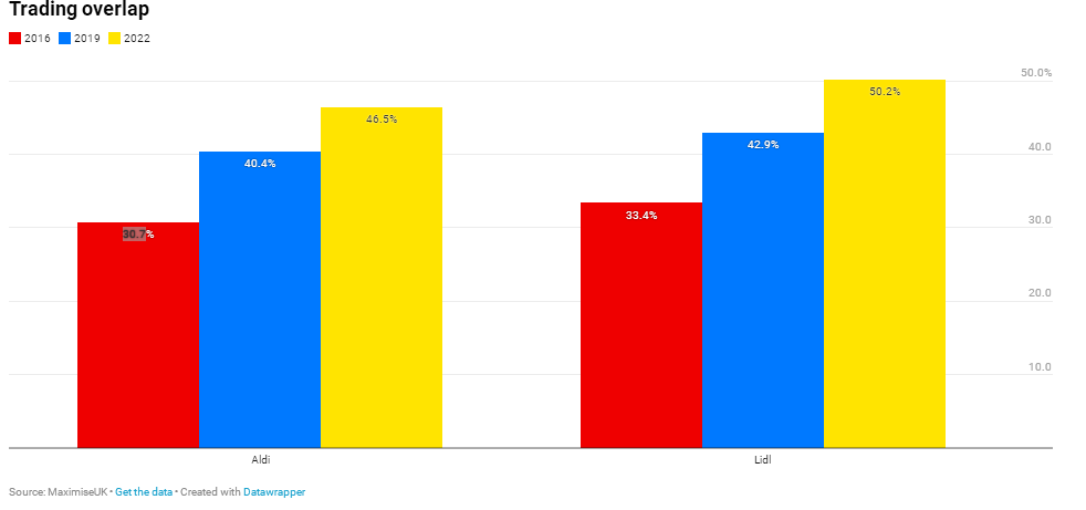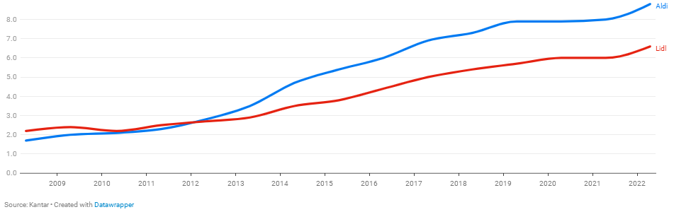 2009至2022年14年來ALDI與LIDL英國市場份額數(shù)據(jù)曲線