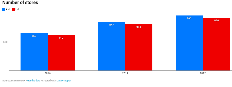 ALDI與LIDL近年來取得的最大進(jìn)步是在英國市場不斷開店。ALDI目前擁有大約960家門店,而2012年僅有470家;LIDL目前已增至大約920家。ALDI和LIDL仍在以每周一家新店開業(yè)的速度努力擴(kuò)張,他們競相尋找新的服務(wù)區(qū)域,以實(shí)現(xiàn)2025年各自的累計(jì)開店目標(biāo):ALDI為1200家,LIDL為1100家。