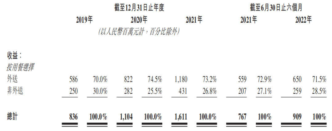 2019年、2020 年、2021年及截至2022年6月30日止六個月,達美樂中國外賣渠道收入分別為5.86億元、8.22億元、11.80億元、6.50億元,占比穩(wěn)定在70%-75%之間,遠高于約49%的行業(yè)平均。