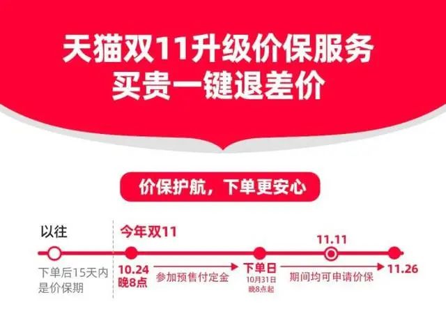 天貓雙11:買貴退差價,今年價保延長至27天。