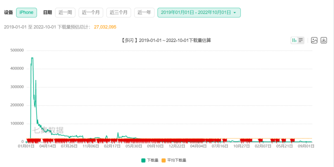 2019年1月1日至2022年10月1日,多閃iOS設(shè)備下載量統(tǒng)計(jì) 圖源:七麥數(shù)據(jù)