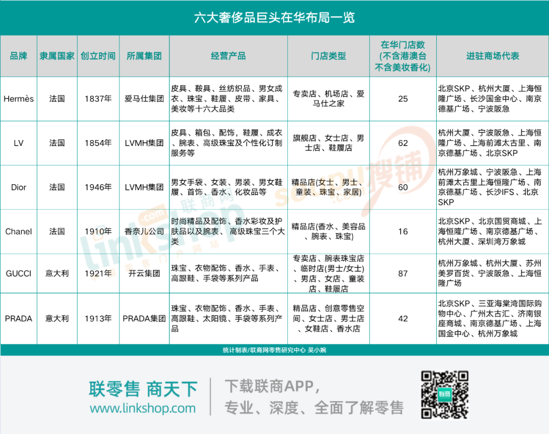 事實(shí)上,奢侈品牌此前也一直將北上廣深一線城市作為開店擴(kuò)張的主要地區(qū),從《聯(lián)商網(wǎng)》統(tǒng)計(jì)的各大奢侈品入駐的代表商場這一點(diǎn)中便可明顯看出。