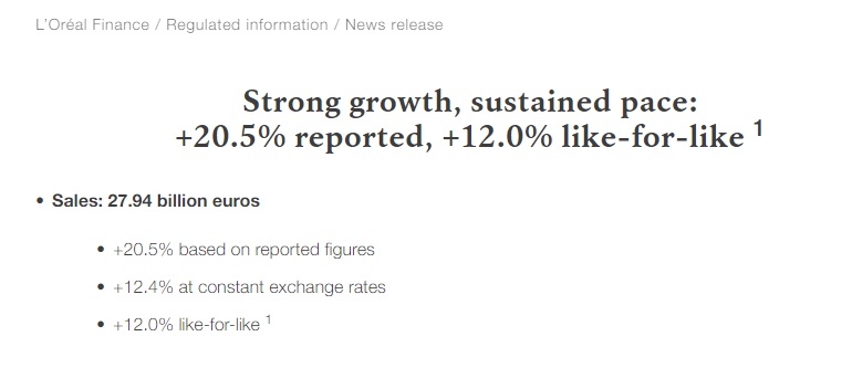 10月21日,歐萊雅集團(tuán)發(fā)布了2022年第三季度財(cái)報(bào),顯示截至2022年9月30日,歐萊雅前三季度實(shí)現(xiàn)279.4億歐元(約合人民幣1977.42億元)的銷(xiāo)售額,基于報(bào)告數(shù)字增長(zhǎng)20.5%,同比增長(zhǎng)12.0%。