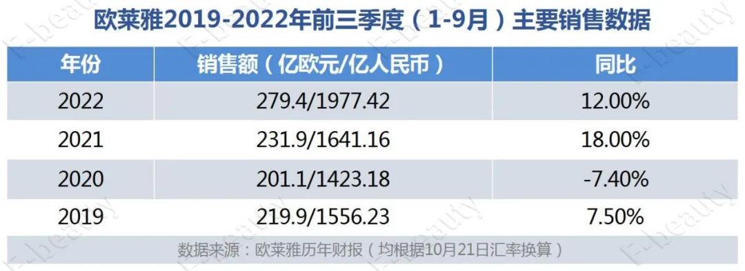 歐萊雅2019-2022年前三季度(1-9月)主要銷(xiāo)售數(shù)據(jù)