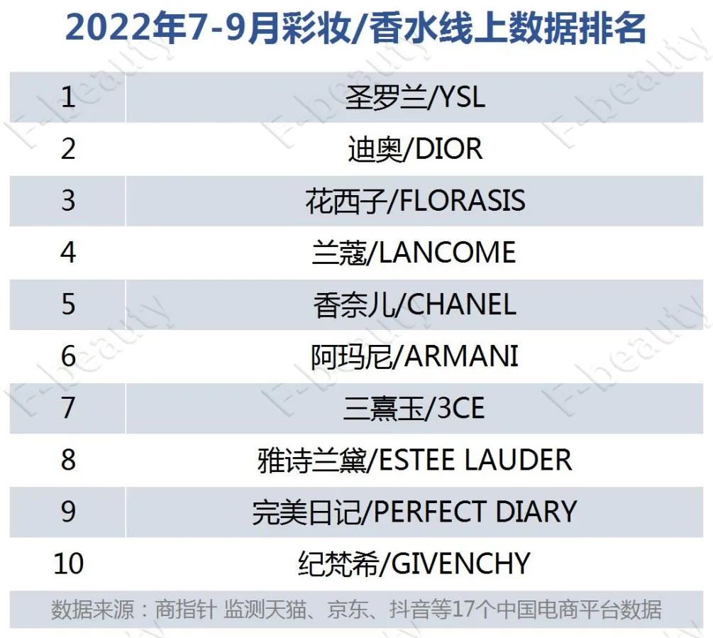 此外,香水彩妝的線(xiàn)上表現(xiàn)也十分亮眼,從商指針監(jiān)測(cè)的7-9月彩妝香水品類(lèi)的線(xiàn)上銷(xiāo)售數(shù)據(jù)看,YSL、蘭蔻、阿瑪尼成績(jī)杰出,占據(jù)前六榜單。其中,YSL排名第一,蘭蔻排名第四。