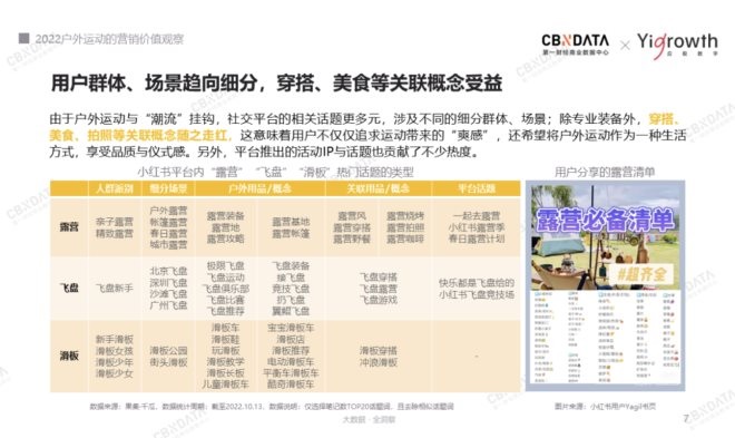 數(shù)量增長之外,戶外相關(guān)話題更加細分。社交平臺上,除戶外垂類KOL分享經(jīng)驗、安利裝備外,還有不少穿搭、時尚、美食等泛潮流圈層的用戶分享嘗鮮體驗、出片心得等,這極大擴充戶外內(nèi)容的類型與范圍,用戶關(guān)注重點從運動效果向休閑娛樂、社交互動傾斜。CBNData《報告》顯示,小紅書“露營”“飛盤”“滑板”相關(guān)筆記量TOP20話題中,包括新手、親子等細分群體的需求,裝備、用品等狹義的戶外類目分享,以及穿搭、美食飲品、社交互動等廣義的“戶外+”概念。
