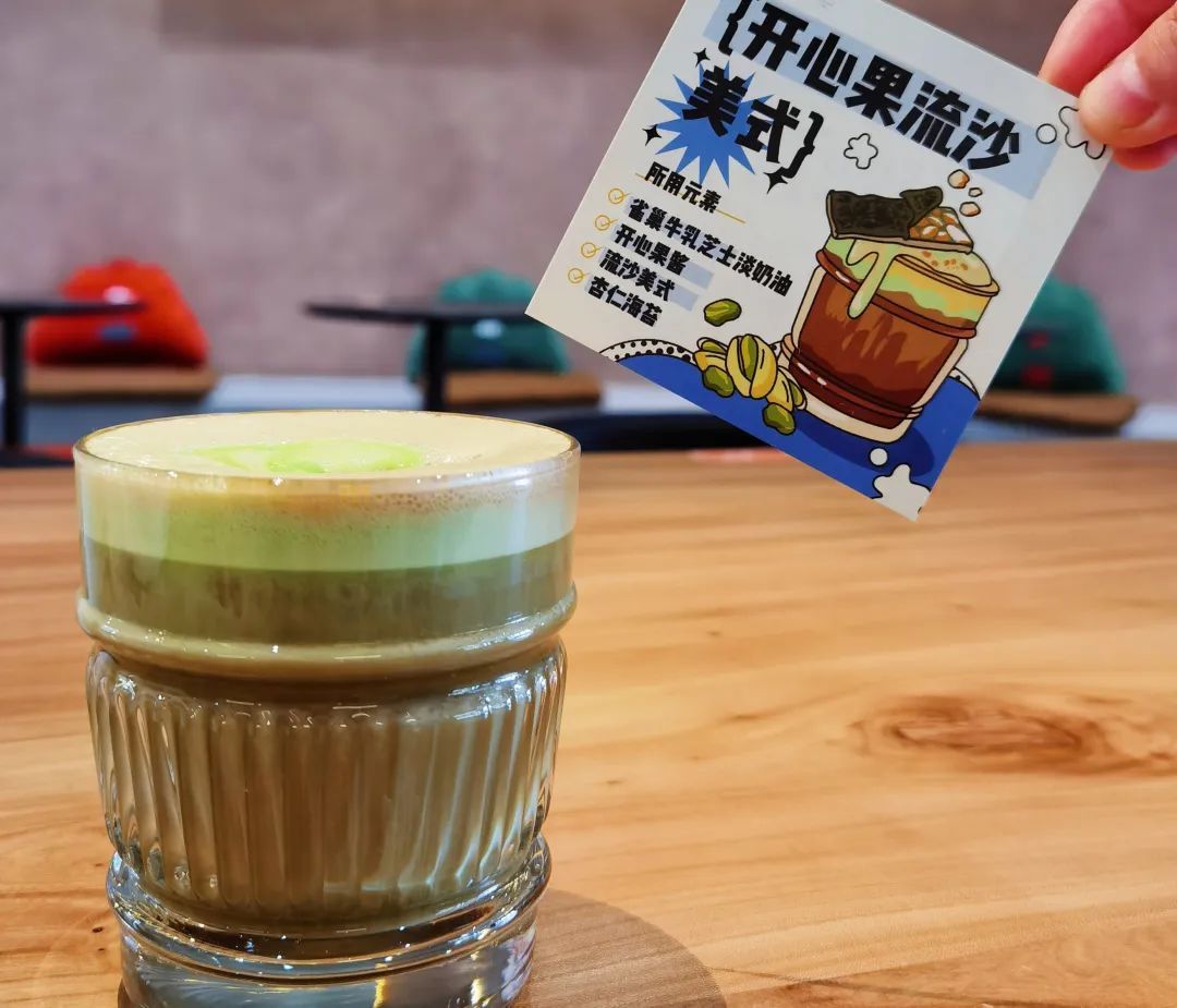 比如北京Cozytime Coffee最近推出一款開心果流沙美式,頂部用開心果醬與雀巢牛乳芝士淡奶油融合打發(fā),開心果的香氣與芝士奶蓋融合,口感豐富,味道平衡。