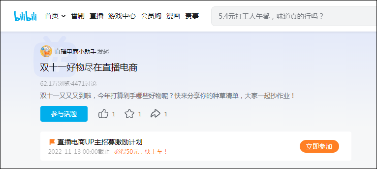 此外,網(wǎng)傳消息顯示,B站官方的“B站直播電商X UP主”交流群內(nèi),群管理員發(fā)布:B站電商針對雙十一所舉辦的話題活動,優(yōu)秀稿件會有額外投放獎勵。