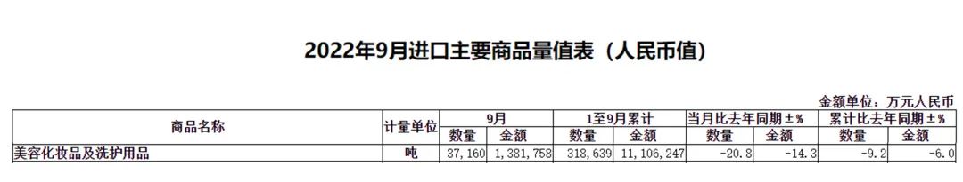 在所有進(jìn)口商品中,美容化妝品及洗護(hù)用品類(lèi)9月進(jìn)口37160.1噸,和去年同期相比下滑20.97%;進(jìn)口金額為138.2億元,同比下滑14.32%;1-9月累計(jì)進(jìn)口318639噸,和去年同期比下滑9.2%;進(jìn)口金額為1110.6億元,同比下滑6%。