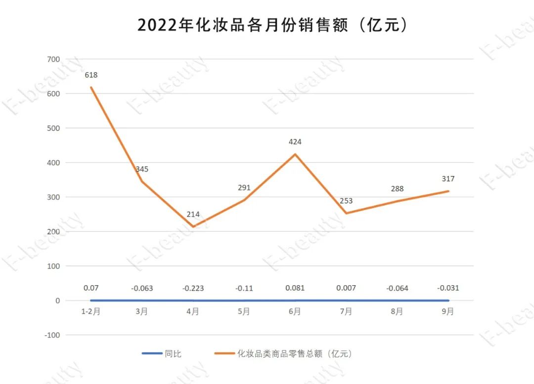 而化妝品類(lèi)走勢(shì)不如大盤(pán)。9月全國(guó)化妝品零售總額為317億元,同比下降3.1%;今年(2022年)前9個(gè)月,化妝品類(lèi)零售總額同比下降2.7%至2774億元。在6、7月迎來(lái)難得的增長(zhǎng)之后,8、9月的化妝品市場(chǎng)依然難抵頹勢(shì)。