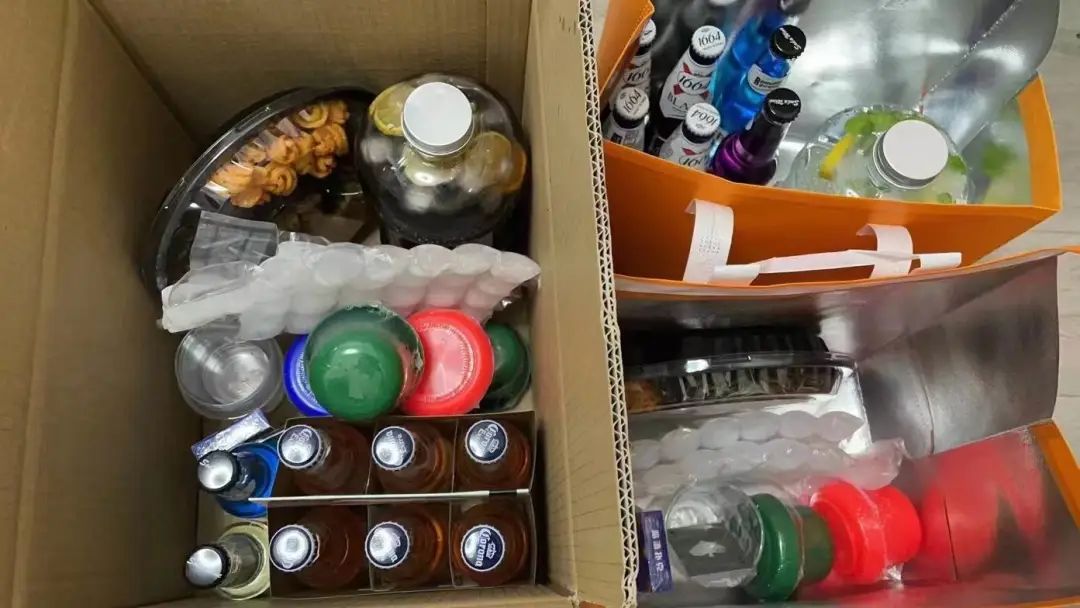 劉姍賣(mài)的最好的是伏特加蜜桃桶和長(zhǎng)島冰茶桶。一個(gè)價(jià)格188元的套餐,包括一桶2.22L的調(diào)制酒、12瓶動(dòng)力酒,還有小吃零食、冰塊、杯子、骰子、撲克牌。