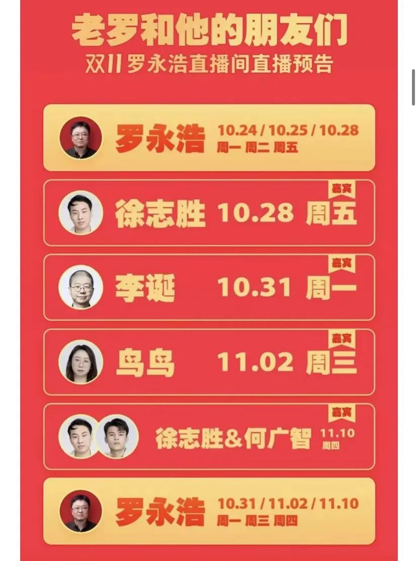 值得注意的是,在羅永浩雙11直播預(yù)告中,羅永浩和他的朋友們,徐志勝、李誕、鳥鳥將先后做客直播間,而在11月10日,雙十一的前一天,徐志勝和何廣智將合體出現(xiàn)在直播間。羅永浩將分別于10月24日、25日、28日、31日,11月2日、10日出現(xiàn)在直播間直播。