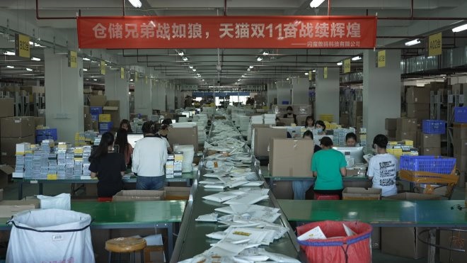 在其位于東莞的倉(cāng)庫(kù)中,碼放整齊的紙箱,各類(lèi)鋼化膜的半成品,正等待進(jìn)入包裝流程。據(jù)閃魔倉(cāng)儲(chǔ)負(fù)責(zé)人介紹,一層5000多平米,幾十萬(wàn)件貨,通常只夠日銷(xiāo)15天,趕上雙11活動(dòng)爆發(fā),鐵定能賣(mài)得更快。