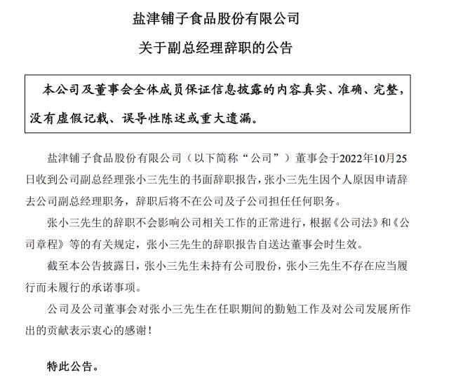 聯(lián)商快訊:10月25日晚間,鹽津鋪?zhàn)影l(fā)布副總經(jīng)理辭職公告。