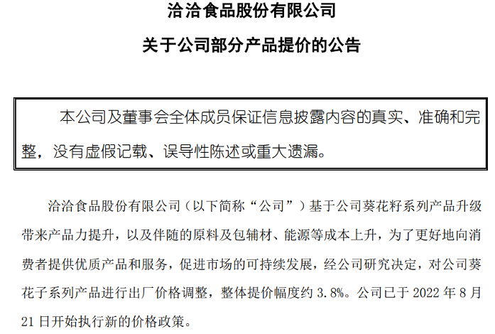 第一次是在2021年10月,當(dāng)時洽洽食品發(fā)布公告稱,將對公司葵花子系列產(chǎn)品以及南瓜子、小而香西瓜子產(chǎn)品進行出廠價格調(diào)整,各品類提價幅度為8%-18%不等,價格執(zhí)行于當(dāng)天開始實施。第二次是在今年8月。