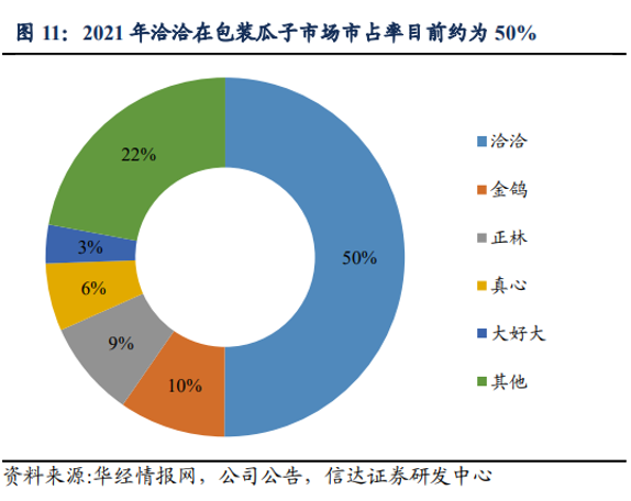 這其中,洽洽食品是瓜子行業(yè)的龍頭,素有“瓜子大王”之稱,2021年的市場份額高達50%,它的變化影響更廣。2020年,洽洽食品還提出了“雙百”(百億營收百萬終端)目標(biāo),如果能順利實現(xiàn),那公司將更加傲視群雄。