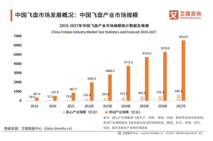 另一方面從行業(yè)上看,2021年,中國(guó)飛盤(pán)產(chǎn)業(yè)核心市場(chǎng)規(guī)模為75.9億元,帶動(dòng)產(chǎn)業(yè)市場(chǎng)規(guī)模為867.7億元。預(yù)計(jì)未來(lái)六年中國(guó)飛盤(pán)核心產(chǎn)業(yè)規(guī)模和帶動(dòng)產(chǎn)業(yè)規(guī)模持續(xù)增長(zhǎng)且增長(zhǎng)速度加快。