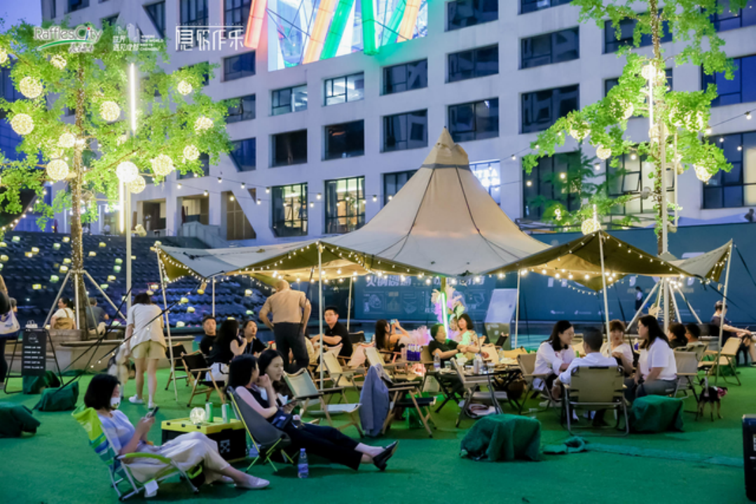 成都來(lái)福士廣場(chǎng)攜手Hygge Land呼噶實(shí)驗(yàn)室在三樓水景平臺(tái)打造“拾光營(yíng)地”,傍山水為鄰,與星辰共舞,舉辦夜場(chǎng)咖酒Party。紅酒+咖啡,Swing dance+Glamping,還有露天星空電影院,打造CBD中的城市綠洲和新社交空間。